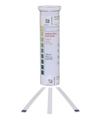 取待測溶液少許,試紙浸入30秒,取出試紙比色,比對結果顯示在“sufficient efficacy”區間的即為有活性,可以繼續使用。