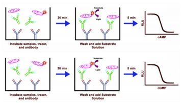 G蛋白是細胞內的重要調控因子,參與細胞運動、代謝和轉錄等生理過程,它通過一系列膜結合受體觸發細胞內的級聯反應來參與調節各種細胞外信號。而調控G蛋白信號級聯反應的關鍵是“第二信使”,即環磷酸腺苷(cAMP)和環磷酸鳥苷(cGMP)。這兩種分子的關鍵功能之一是激活鳥嘌呤交換因子(GEF),而GEF反過來又在G蛋白的活化中發揮作用。因此,檢測cAMP / cGMP水平,是研究細胞內眾多信號通路必不可少的實驗之一。美國Cell Biolabs公司提供了一種穩定、高效的檢測cAMP/cGMP濃度的試劑盒,其采用競爭ELISA的方法,檢測靈敏度可達1 pmol/mL,并且試劑盒特異性強,不與其他第二信使發生顯著交叉反應,適用于檢測的樣品類型廣泛,包括細胞/組織裂解液、唾液、尿液、血清和細胞上清等。