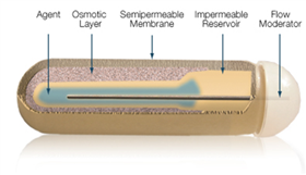 ALZET® Osmotic Pumps 是體積只有膠囊大小的滲透壓泵,符合 USP 醫療塑料膠材料生物相容性標準,可植入實驗動物皮下或腹腔內,直接或通過導管以 ul/小時的速度緩慢持續準確地送出測試藥劑。Alzet 緩釋泵由外到內分為三層(如下圖所示),最外層是半透膜材料(Semipermeable Membrane),最內層為不透水彈性材料制成的貯藥囊(Impermeable Reservoir),中間為高滲的鹽夾層(Osmotic Layer)。當泵體被植入動物體內時,由于滲透壓差迫使體液透過泵表面的半透膜流向高滲鹽夾層,擠壓貯藥囊,使藥物(Agent)按照預計速度經導流管(Flow Moderator)釋放到動物體內。
