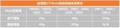 埋植多個Alzet泵必須確保動物體重足夠大,能容納多個泵的大小和重量。下表總結了埋植2個指定型號給藥泵時動物需要滿足的最小體重。