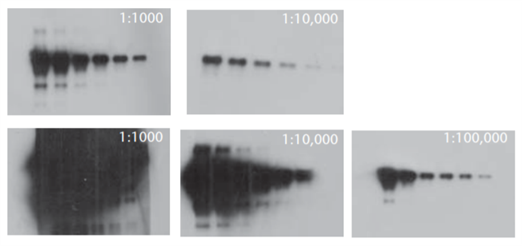該產(chǎn)品是基于魯米諾開發(fā)的一種非同位素的HRP底物,當(dāng)有H2O2存在時(shí),HRP可催化魯米諾發(fā)光,且這個(gè)反應(yīng)相當(dāng)迅速。該底物檢測(cè)信號(hào)與被檢蛋白濃度呈非常好的正相關(guān)關(guān)系,靈敏度高達(dá)pg級(jí)別。此外,反應(yīng)物可從膜上洗去,然后重新加入底物反應(yīng),如此進(jìn)行實(shí)驗(yàn)結(jié)果的優(yōu)化而不再需要重復(fù)全部WB過(guò)程。LumiGLO Reserve是對(duì)LumiGLO的第二代升級(jí)產(chǎn)品,可檢測(cè)pg-fg級(jí)(HRP g/ml)