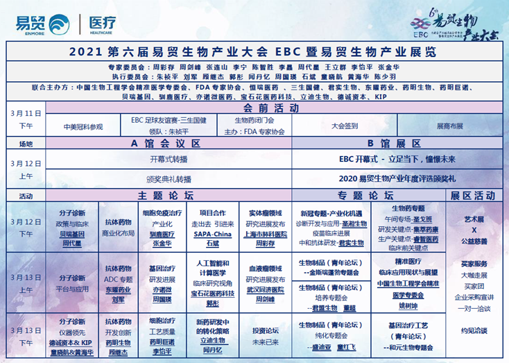 2021第六屆易貿生物產業大會EBC將于3月11-13日在蘇州國際博覽中心隆重召開。EBC 2020年參會人數2724人,2021年將突破4000人規模,參會人群覆蓋創業者、科學家、臨床醫生、投資人和供應商等。同期開展的易貿生物產業展覽,將有超過200家儀器、耗材、服務等供應商展出,會+展聯動的EBC,已成為國內外生物產業高層交流與合作的標桿平臺。