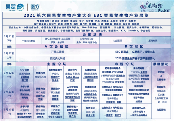 EBC易貿生物產業大會是中國規模最大、最具影響力的生物產業大會。2020年EBC參會人數2724人,2021年將突破4000人規模,參會人群覆蓋創業者、科學家、臨床醫生、投資人和供應商等。同期開展的易貿生物產業展覽,將有超過200家儀器、耗材、服務等供應商展出,會+展聯動的EBC,已成為國內外生物產業高層交流與合作的標桿平臺。
