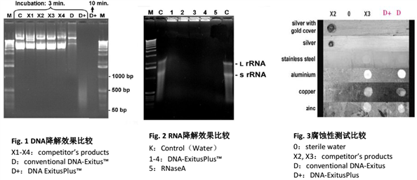 傳統的核酸污染清除多通過修飾、酶解(如DNase)或變性等幾種方式,實踐證明這些方式存在核酸降解不徹底、試劑具有腐蝕性和毒性等不足。德國AppliChem的DNA-ExitusPlus?(貨號A7089)是一種無腐蝕、無致癌性的核酸(包括DNA、RNA)清除試劑,該產品可斷裂雙鏈DNA并將其降解,且已降解的核酸片段不能被恢復,從而能徹底消除PCR過程中由于非目標DNA導致的假陽性擴增。
