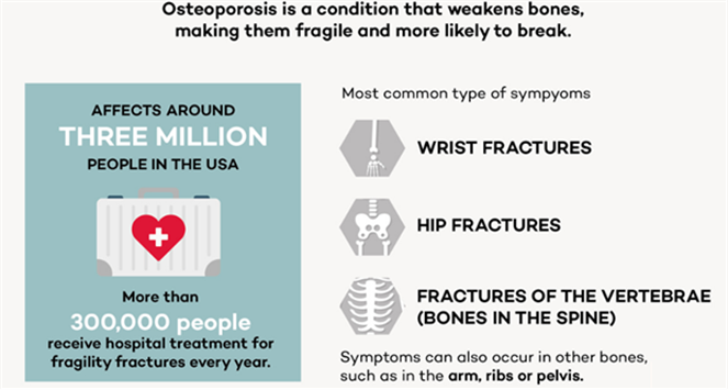 骨質疏松癥是一種以骨密度降低為特征的肌肉骨骼系統疾病。肌肉骨骼系統是由骨骼、肌肉和相關元素,如軟骨、結締組織和關節所組成。它為身體提供形態、支撐和穩定性,并使其運動。骨密度的降低會導致骨骼的收縮,從而會導致骨骼變得脆弱,增加骨折的風險。