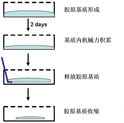 細胞收縮后膠原基質的形態變化(虛線表示膠原基質的邊緣)