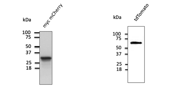 ? ? 西美杰代理SICGEN品牌提供的Anti-mCherry和Anti-tdTomato均為從圓盤(pán)珊瑚中提取的紅色熒光蛋白的多克隆抗體。Anti-mCherry和Anti-tdTomato兩種抗體的抗原均是大腸桿菌表達(dá)的重組多肽純化而來(lái),用Western blot檢測(cè)轉(zhuǎn)染了兩種蛋白的HEK293細(xì)胞,分別可檢測(cè)到29kda和55kda的條帶。Anti-tdTomato抗體對(duì)tdTomato和mCherry均有特異性,但與綠色熒光蛋白(GFP)不發(fā)生交叉反應(yīng)。???????????