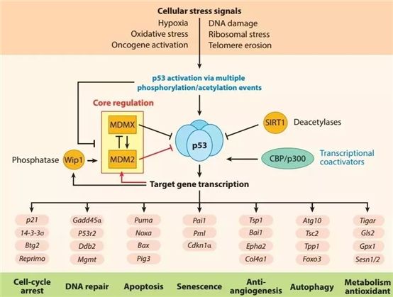 通常情況下,p53蛋白在正常細胞中壽命很短,表達水平也低。但在經歷了基因損傷或致癌基因激活時,許多腫瘤細胞表達高水平的突變p53蛋白,在眾多調控通路中,磷酸化對p53蛋白活性的調節起關鍵作用,目前最廣泛被接受的觀點是:當DNA損傷溫和且短暫時,p53主要發揮促進生存(pro-survival)功能,比如促進細胞周期停滯,促進DNA修復,降低活性氧,提高能量供應等。當DNA損傷難以修復時,p53則會促進死亡(pro-death)的模式,比如誘導細胞衰老,凋亡或者鐵死亡等。