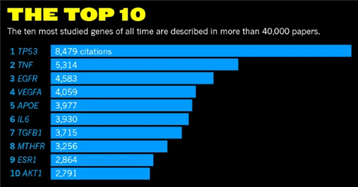 科學家們在癌癥領域做了大量的研究,目前的主要策略是降解突變體p53,或者改造突變體p53的蛋白折疊,使其恢復野生型p53的構象和功能。在藥物研發上,想要抑制一個蛋白的功能容易,想恢復一個蛋白的功能卻很難,所以,到目前為止仍沒有一款靶向p53的抗癌新藥上市,該領域藥物開發已成為人們最關注的靶點之一,在Nature雜志2017年的一項統計中,TP53基因以絕對優勢位列過去幾十年最熱門研究基因榜第一名。