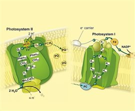 光系統I(PSI)是整合于光合膜上的由多個蛋白亞基組成的色素蛋白復合物,它在光合電子傳遞鏈中催化電子從類囊體膜內的蛋白質體藍素(PC)和細胞色素c6轉移到類囊體膜外的還原鐵氧還蛋白(Fd)或黃素氧還蛋白。PSI相對較多地分布于葉綠體類囊體膜基質膜區,目前已知,PSI由12(細菌)或13(高等植物)個蛋白亞基組成,根據他們的基因把這些亞基分別命名為PsaA到PsaX。在組成PSI的蛋白亞基中,PsaA和PsaB以異二聚體狀態結合做為反應中心,里面包含電子原初供體P700和中心電子傳遞鏈A0、A1和FX。P700激發態的電子原初受體是A0,次級受體A1為2個葉醌分子,再將電子傳遞給一個含4Fe-4S中心的鐵硫蛋白(FeSx),最后電子供給含2Fe-2S中心的鐵氧還蛋白(Fd),最后在Fd-NADP還原酶(FNR)的催化下,將NADP+還原為NADPH。藍細菌、綠藻和高等植物的PSI復合物還包含3個外周蛋白PsaC、PsaD、PsaE以及5個膜內周蛋白PsaL、PsaK、PsaF、PsaI、PsaJ。一般認為PsaD通過與帶有負電荷的Fd之間的靜電作用而為Fd提供必要的結合位點,同時,PsaD也是PsaC和PsaE正確組裝進PSI所必需的。PsaE是Fd還原所必需的,并可能參與PSI周圍的環式電子傳遞。PsaL是組成PSI的三聚體必不可少的一個亞基。PsaF暴露在基質一側的亞基,能夠與Pc和Cytb6f關聯。PsaM存在于藍藻PSI中。其它亞基如PsaJ、PsaK、PsaI和PsaM都很小,這些亞基從細菌到高等植物都嚴格保留。