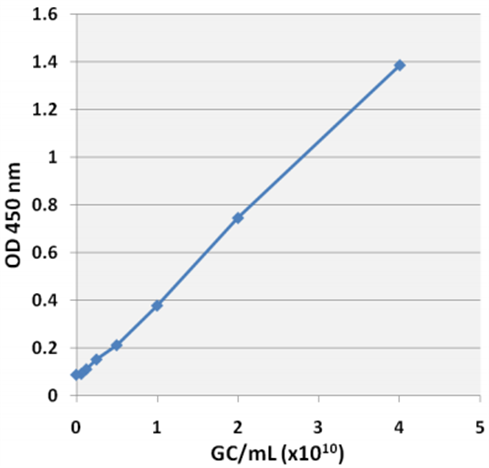 AAV衣殼是由VP1、VP2和VP3三種蛋白質混合構成,平均每一個病毒粒子中包含60個VP分子,其比例為5 VP1 : 5 VP2 : 50 VP3。試劑盒中提供的96孔板已預包被了可以結合三種VP蛋白的捕獲抗體,當AAV樣品或標準品加入到96孔板中,其AAV衣殼蛋白就會與捕獲抗體結合。經過孵育和洗板等步驟后,再分別加入AAV VP衣殼抗體和HRP標記的二抗,而未結合的抗體將被洗脫下來。經底物顯色后,測定450nm處的吸光度,最后通過AAV標準曲線計算未知樣品中AAV衣殼蛋白濃度,進而計算出樣本中AAV滴度。