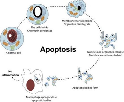 凋亡的特征具有明顯的形態(tài)變化以及特定caspase和線粒體控制通路的激活。凋亡細(xì)胞出現(xiàn)細(xì)胞體積縮小,與周圍細(xì)胞脫離,然后細(xì)胞質(zhì)密度增加,通透性改變,染色質(zhì)濃縮和核碎裂,并顯示出稱為膜起泡的典型變形的膜,膜內(nèi)側(cè)磷酯酰絲氨酸外翻到膜表面,胞膜結(jié)構(gòu)仍然完整,無內(nèi)容物外溢,不引起周圍的炎癥反映。膜起泡可導(dǎo)致在垂死細(xì)胞邊緣形成小囊泡,稱為凋亡小體。凋亡小體可迅速被周圍的吞噬細(xì)胞吞噬。凋亡可以通過內(nèi)在或外在通路觸發(fā),內(nèi)在通路可以通過細(xì)胞應(yīng)激、DNA損傷、發(fā)育信號(hào)、存活因子缺失被激活,外在通路則是通過檢測到來自其他細(xì)胞的細(xì)胞外死亡信號(hào)來觸發(fā)的。