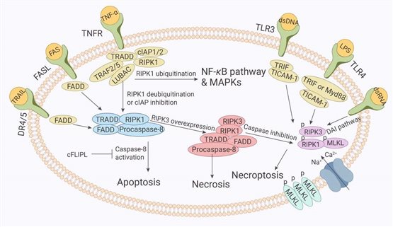 Fas又稱CD95,是由325個(gè)氨基酸組成的受體分子,它與其配體FASLG(CD178)結(jié)合可以啟動(dòng)凋亡信號(hào)的轉(zhuǎn)導(dǎo)引起細(xì)胞凋亡。Fas具有特殊的死亡結(jié)構(gòu)域(DD,death domain),三聚化的Fas和FASLG結(jié)合后,使三個(gè)DD相聚成簇,吸引了胞漿中另一種帶有相同死亡結(jié)構(gòu)域的蛋白FADD。FADD是死亡信號(hào)轉(zhuǎn)錄中的一個(gè)連接蛋白,它由兩部分組成:C端(DD結(jié)構(gòu)域)和N端(DED)部分。C端與Fas的DD結(jié)構(gòu)域結(jié)合,N端連接另一個(gè)帶有DED的后續(xù)成分,由此引起N端DED隨即與無活性的caspase-8發(fā)生反應(yīng),進(jìn)而引起caspases級(jí)聯(lián)反應(yīng),誘發(fā)細(xì)胞凋亡。Fas/FASLG涉及許多癌癥和免疫疾病的發(fā)病機(jī)制,如多發(fā)性硬化癥[2]。