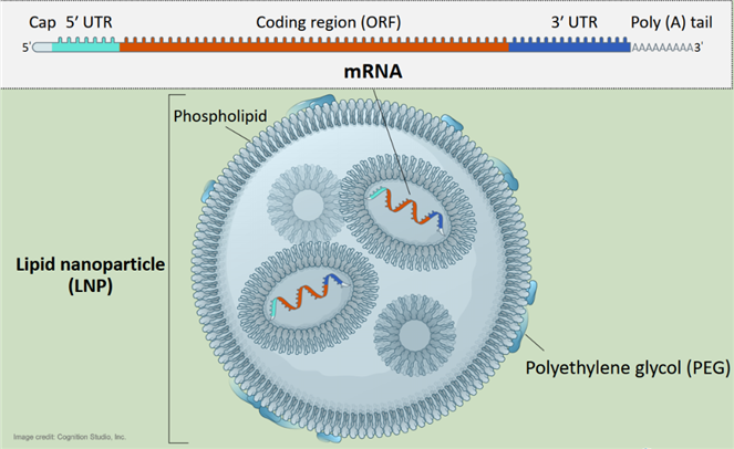 以線性DNA為模板,利用體外轉錄技術(IVT)制備mRNA, 此階段制備的mRNA,包含5'端加帽結構(Cap)和3'polyA加尾結構 |