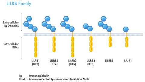 ? ? ? 白細胞免疫球蛋白樣受體 (The leukocyte immunoglobulin-like receptors, LILRs)?由抑制性LILR亞家族B(LILRB1-5)和激活性LILR亞家族A(LILRA1-6)組成。LILRB家族受體屬于I型跨膜糖蛋白,胞外區含有Ig樣結構域,胞內區含有免疫受體酪氨酸抑制基序(ITIM)結構域,是免疫抑制性受體。LILRBs(LILRB1-5)主要在髓系細胞表達,同時在腫瘤干細胞上也高表達,并可能直接調控癌癥的發生和復發以及腫瘤干細胞的活性。LILRBs能抑制腫瘤免疫活性,并支持癌細胞在多種癌癥中存活,促進腫瘤生長和轉移。