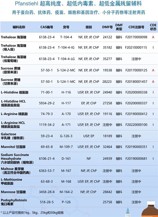 本次論壇西美杰將重點展出Pfanstiehl將高純度低內毒素注射用糖類及氨基酸等十余種輔料產品。