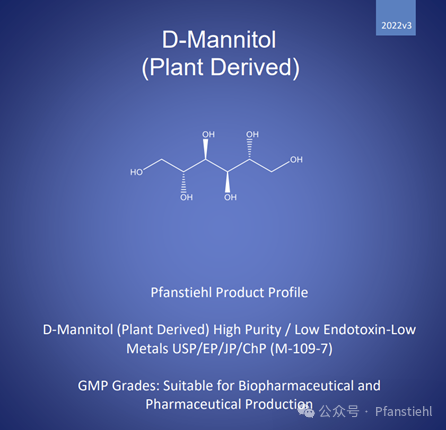 Pfanstiehl品牌D-甘露醇,秉承一貫高品質理念,按照ICHQ7質量體系生 產,具有高純度,超低內毒素,超低微生物含量的特點,并單獨檢測29種金屬離子含量(ppb水平),符合多國藥典,滿足生物制藥和疫苗對于注射級別甘露醇的生產要求。
