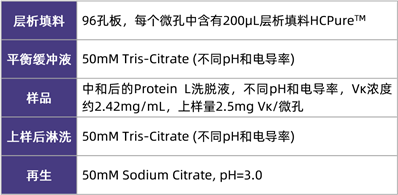 在該應(yīng)用案例中,研究人員使用大腸桿菌(E. coli )表達(dá)納米抗體Vκ,收獲液先經(jīng)過Protein L親和層析純化,洗脫液經(jīng)中和后調(diào)節(jié)成不同的pH(6.0-8.0)和電導(dǎo)率(6-18mS/cm),隨后以流穿模式上樣HCPureTM,收集流穿液和淋洗液,檢測Vκ和HCP的含量,以探究HCPureTM的最佳上樣條件。測試條件如下表所示: