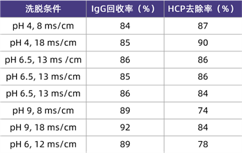 在該應(yīng)用案例中,研究人員使用CHO細(xì)胞表達(dá)IgG型單克隆抗體,澄清后的收獲液先經(jīng)過Protein A親和層析純化,洗脫液經(jīng)中和后調(diào)節(jié)成不同的pH(4.0-9.0)和電導(dǎo)率(8-18ms/cm),再以流穿模式上樣到HCPureTM中,收集流穿液和淋洗液,檢測IgG和HCP含量,其中,pH 6.0、電導(dǎo)率12ms/cm是未經(jīng)調(diào)節(jié)的親和層析洗脫中和液。