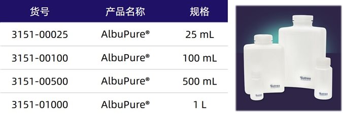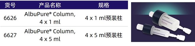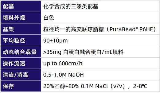 AlbuPure®是Astrea Bioseparations和Albumedix公司合作開發的白蛋白親和層析填料,填料基架是粒徑均一的高交聯瓊脂糖,配基是合成的三嗪化合物,具體高流速、高動態結合載量、強化學耐受性等特點,主要用于白蛋白融合蛋白的純化。AlbuPure®的性能參數如下表所示。