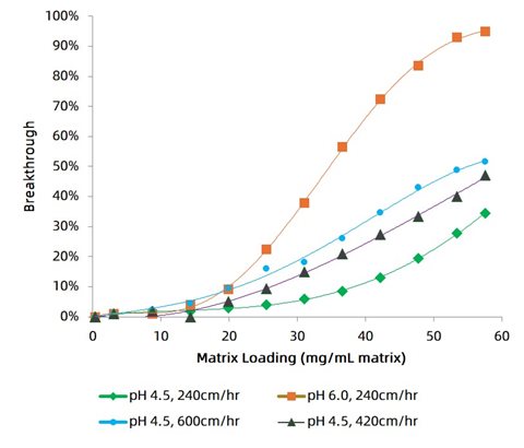 AlbuPure®具有卓越的白蛋白融合蛋白結合性能,如圖4所示,研究人員在不同pH值不同流速的上樣條件下,探究了AlbuPure®對scFv-rHSA的動態結合載量,結果表明,在pH=4.5,240cm/h線性流速下,AlbuPure®對目標融合蛋白的動態結合載量最佳,10%流穿時,載量高達38.4mg/mL。
