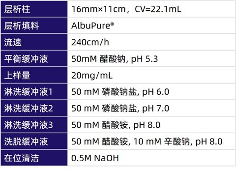 在一項研究測試中,研究人員使用酵母體系表達Anti-HIV gp41-rHSA融合蛋白(72kDa),收獲液經澄清后,上樣到裝有AlbuPure®的層析柱中,層析工藝參數如下表所示: