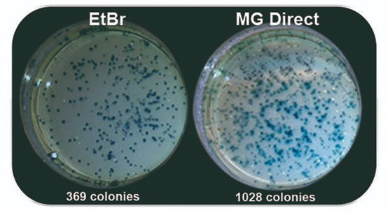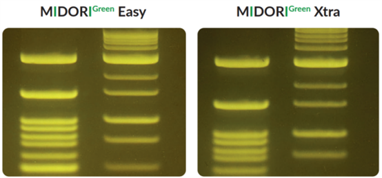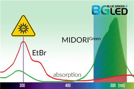 紫外光與EtBr染色至今仍一起被用于分子生物學(xué)實(shí)驗(yàn)室中檢測(cè)核酸。然而紫外光譜會(huì)導(dǎo)致DNA樣品的修飾和降解,30秒的紫外線曝光足以大幅降低克隆效率。藍(lán)/綠LED在470 nm - 520 nm處發(fā)出安全可見(jiàn)光,這種光譜對(duì) DNA 沒(méi)有破壞性,與紫外光相比,DNA完整性和克隆/測(cè)序效率完全不受影響,即使在長(zhǎng)時(shí)間的光照下也是如此。MIDORIGreen系列核酸染料經(jīng)過(guò)優(yōu)化,可在紫外光或藍(lán)/綠光激發(fā)時(shí)獲得更亮的信號(hào),同時(shí)也兼容紫外光。