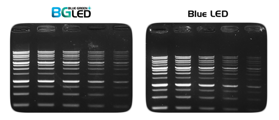 圖3:使用MIDORI Green Xtra檢測(cè)的DNA條帶具有超高靈敏度(注:左圖使用藍(lán)色/綠色 LED 透射儀進(jìn)行檢測(cè);右圖使用藍(lán)色LED透射儀進(jìn)行檢測(cè)。)