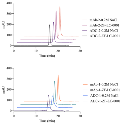 圖5. 使用ZF-LC-0001與常規高鹽流動相的SEC色譜圖對比(樣品分別為2種mAb與2種ADC藥物)