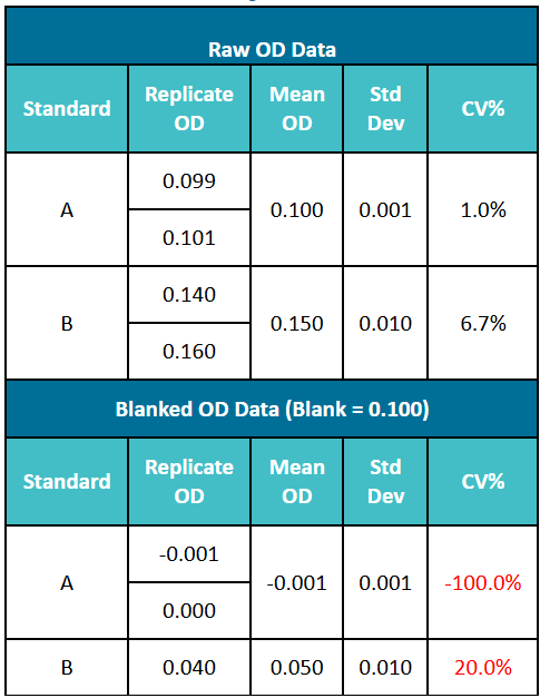 以下示例說明了背景值扣除對變異系數的影響。在表1中,標準A的平均OD值為0.100,標準B的平均OD值為0.150 。當通過原始讀數減去空白對照的OD值來計算變異系數(CV)時,CV值顯著上升,導致標準B的CV%從6.7%增加至20%。