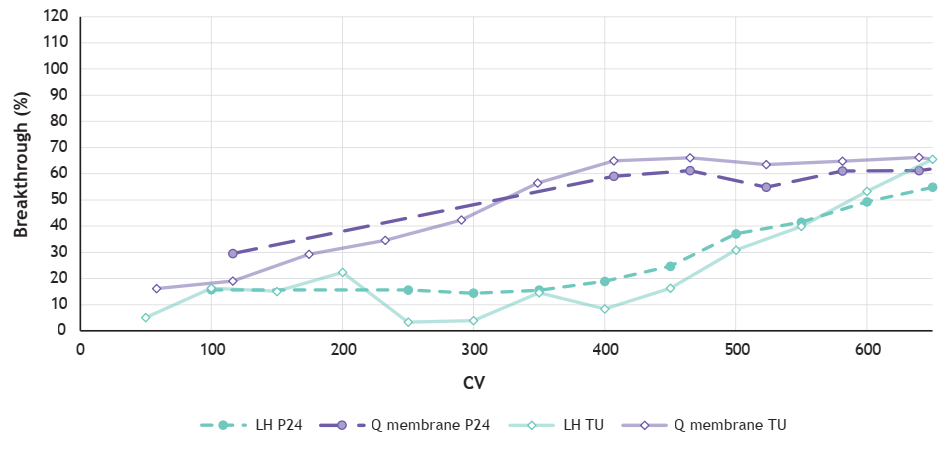 下圖是VSV-G LVV樣品在不同流速下通過LentiHERO(LH)與Q膜流穿液的TU和p24檢測結(jié)果,LentiHERO對LVV的結(jié)合能力顯著高于Q膜。由此表明,LeniHERO在LVV流穿之前能夠處理更大體積的料液。